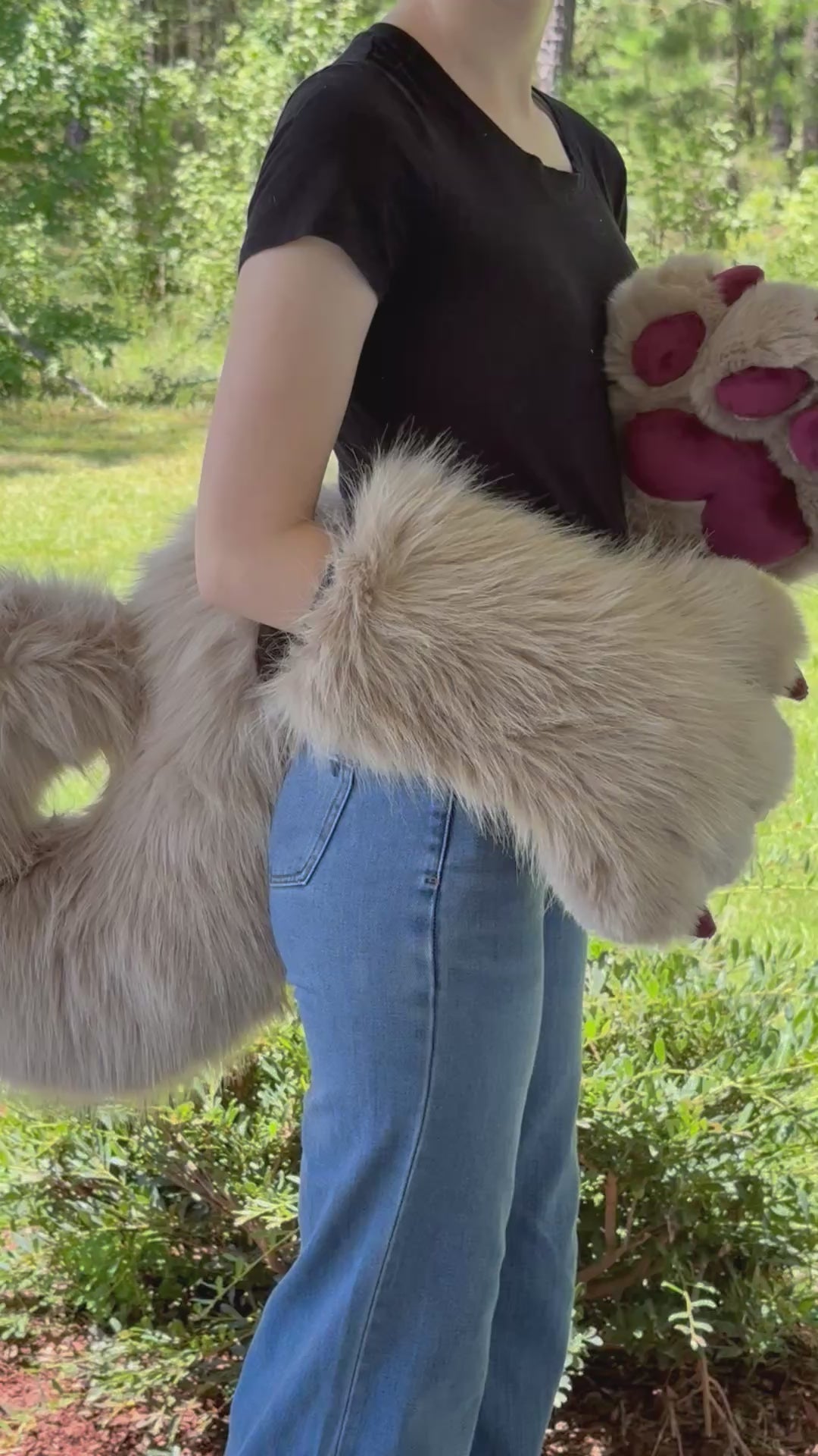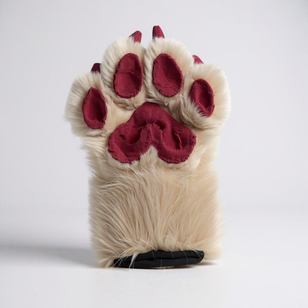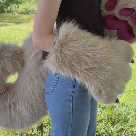This fursuit set features a beige and burgundy red curled tail with a hidden fursuit belt loop and ultra-soft burgundy-red mink paw pads.