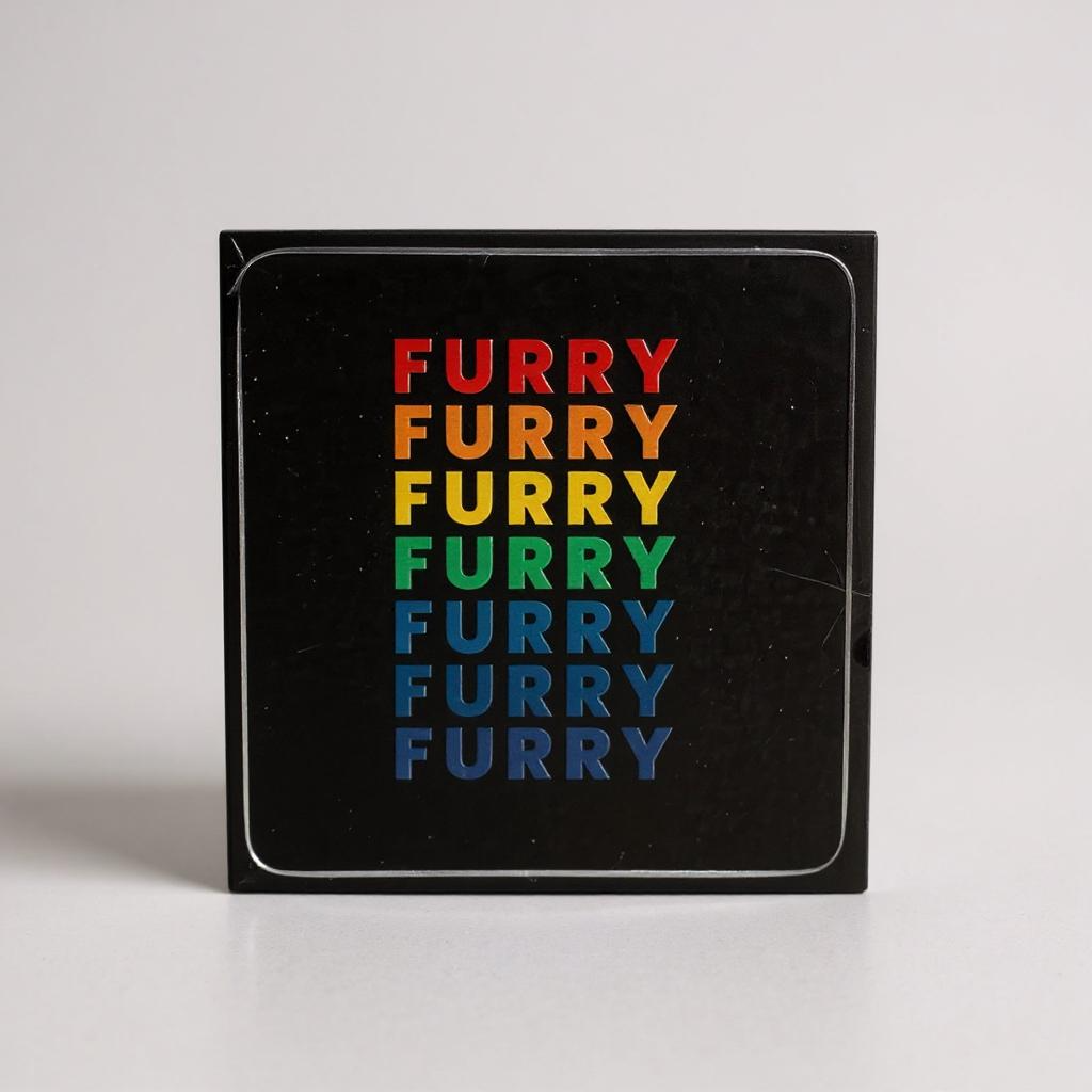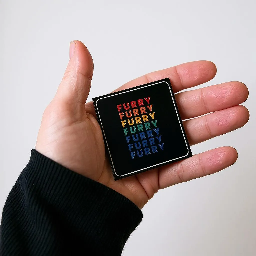A 2-inch by 2-inch Square Furry Sticker. In a Rainbow of colors.