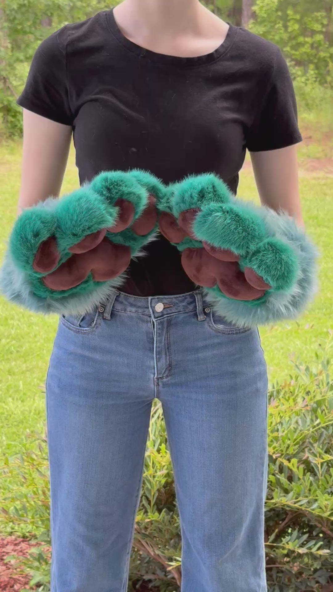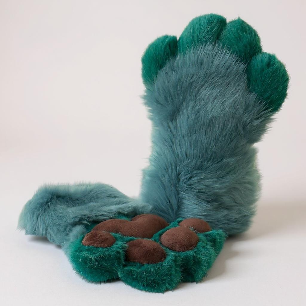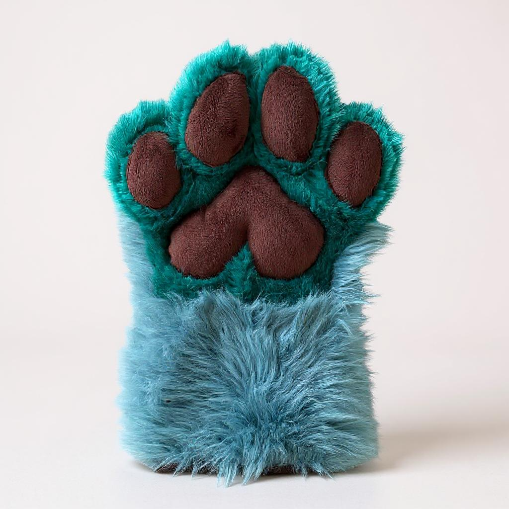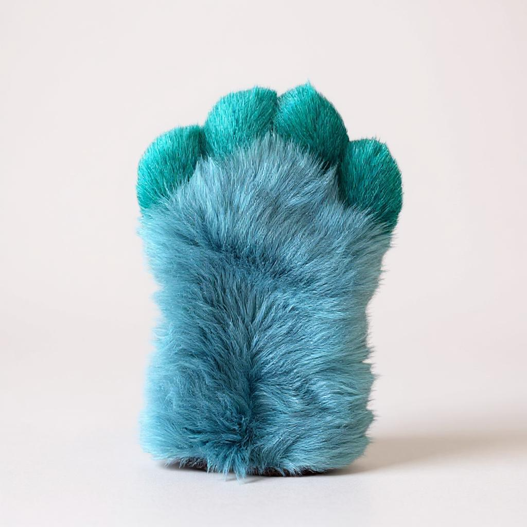 We crafted these paws from a captivating blue and teal faux fur, creating a striking visual appeal. For the paw pads, we chose a rich dark brown mink fabric.