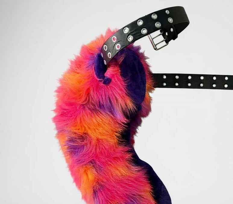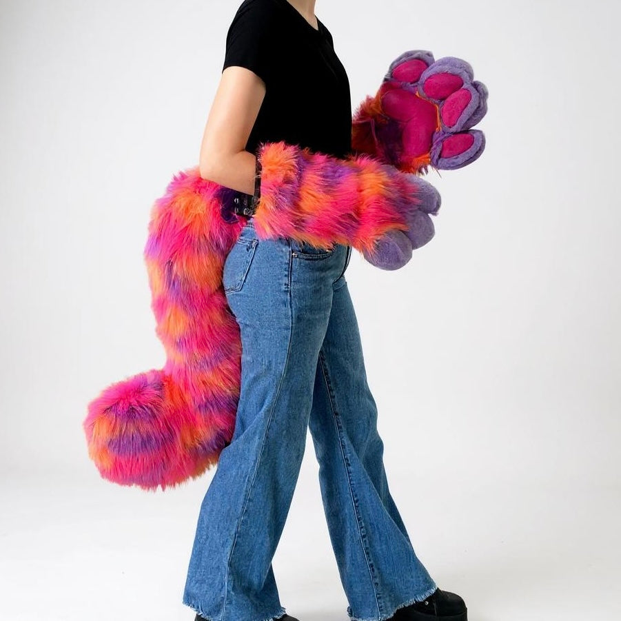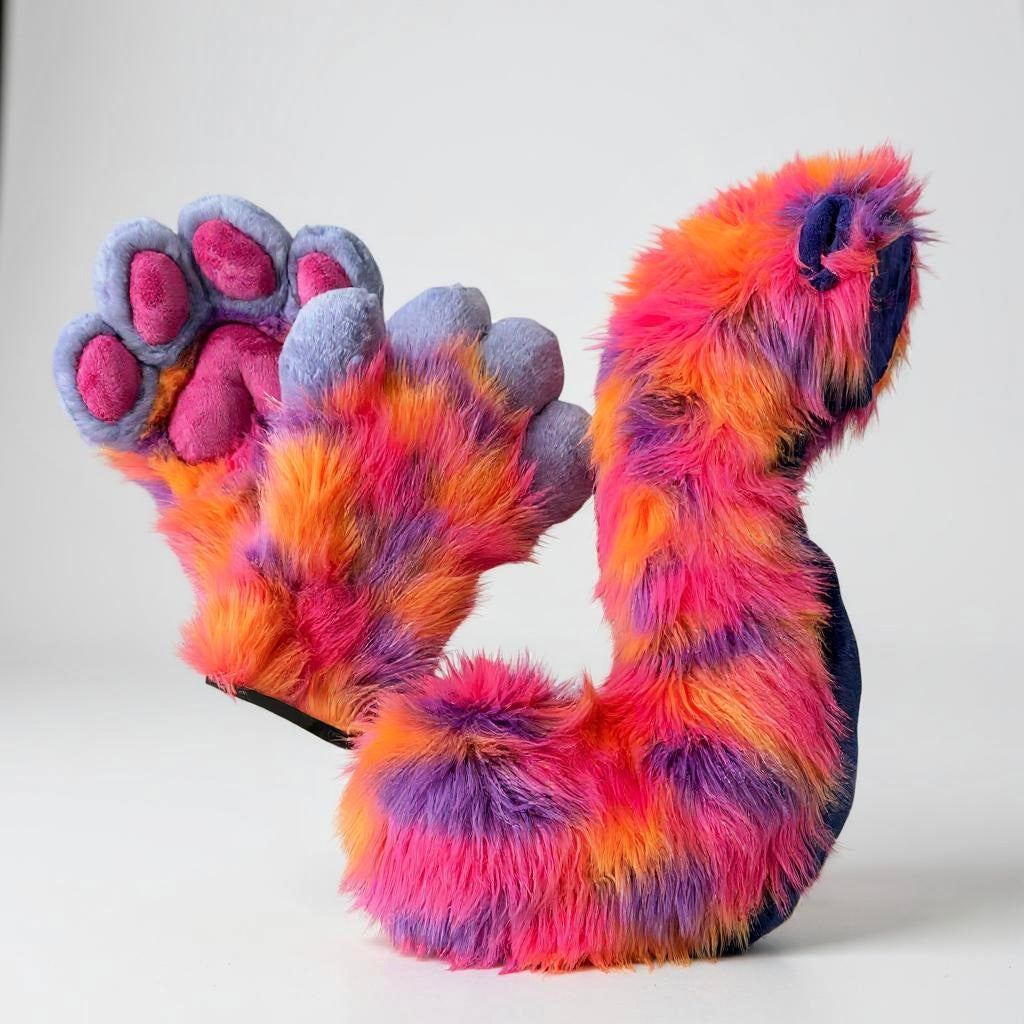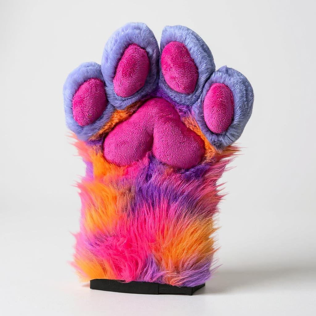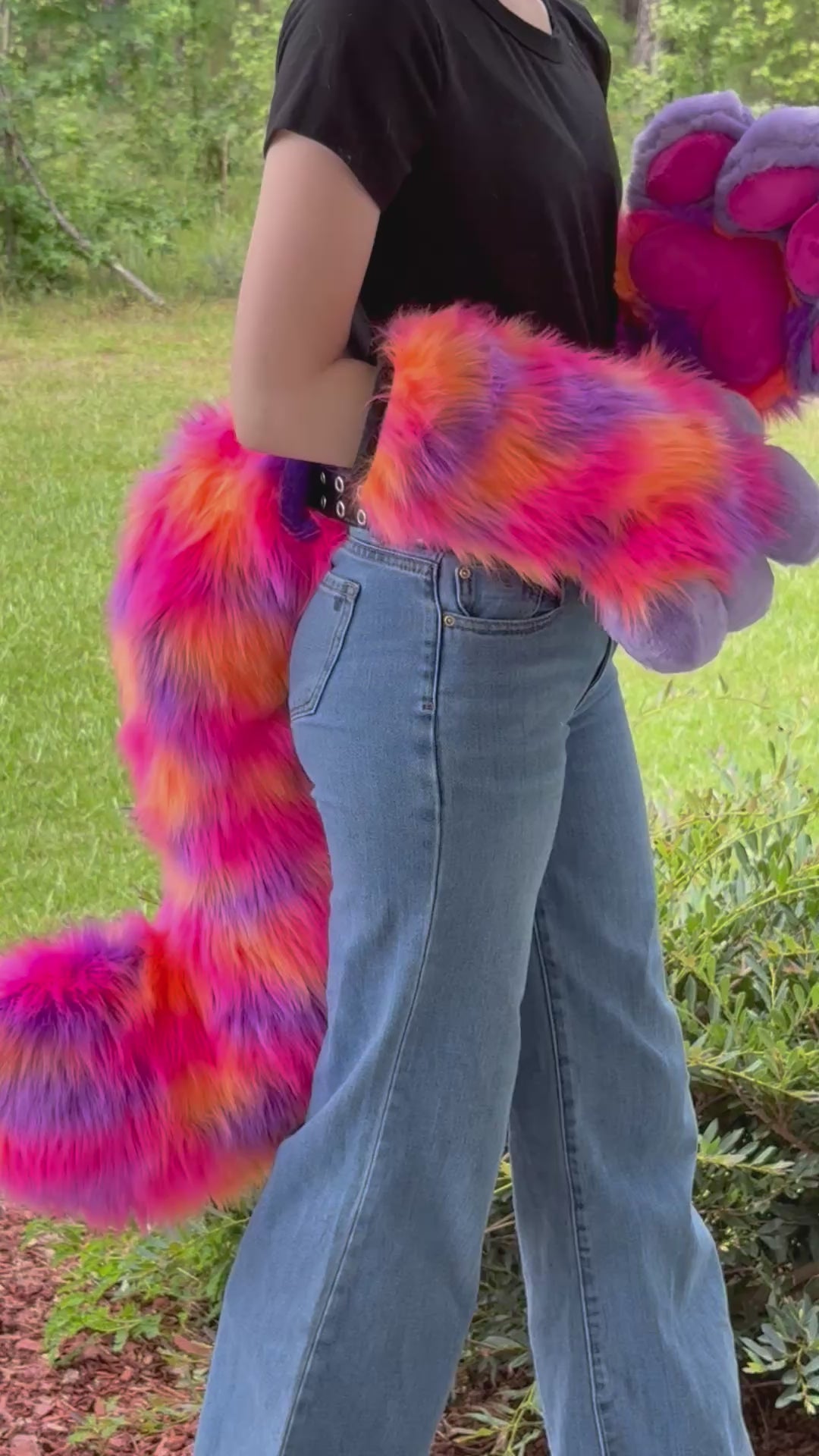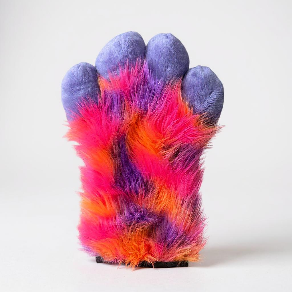 Rock these vibrant orange, pink, and purple paws. The design features two alternating shades: a shiny, super plush dark purple and a lavender purple short-pile of faux fur for the back of the paws. The paw pads are made of ultra-soft, short-pile purple mink fabric—short-pile purple mink fabric for the paw pads. Even glows in UV light!