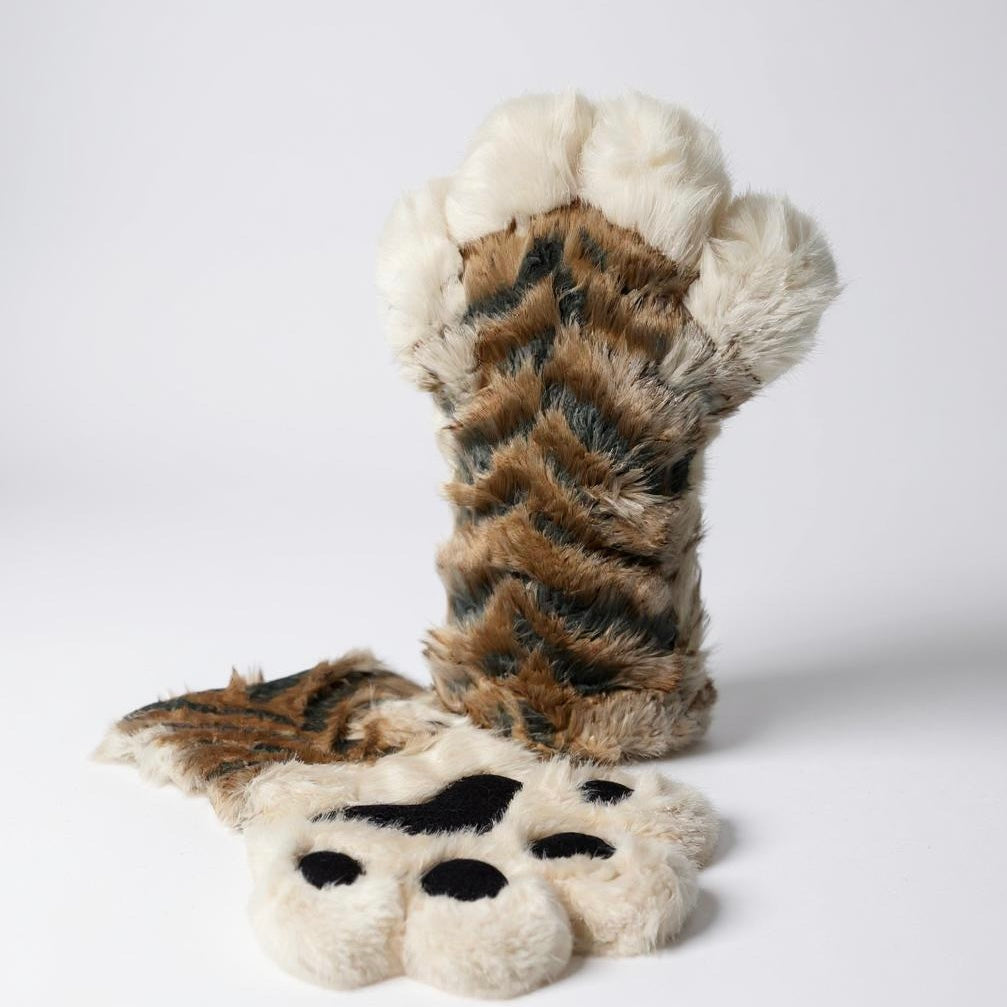 Keep your fursona looking wild with this cool brown and gray shadow chevron animal stripes faux fur! It mimics the natural pattern of animal fur and looks fantastic. The paws are super soft and fuzzy with a cool beige faux fur, and the paw pads are black fleece. So, if you want your furry friend to look their best, this is the perfect choice!